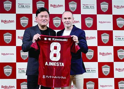 ■5月24日,西班牙球员伊涅斯塔(右)与神户胜利船俱乐部主席三木谷浩史在新闻发布会上共同展示新球衣。当日,西班牙球员伊涅斯塔加盟神户胜利船俱乐部。