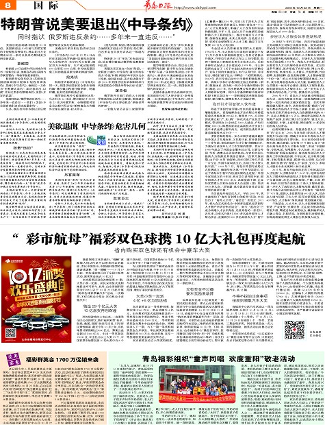 特朗普说美要退出《中导条约》美欲退出《中导条约》危害几何“彩市航母”福彩双色球携10亿大礼包再度起航福彩群英会1700万促销来袭青岛福彩组织“童声同唱 欢度重阳”敬老活动青岛:广开进贤路,塑造新优势