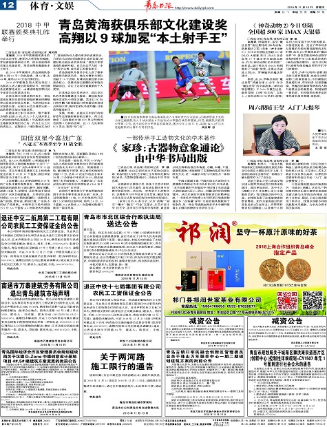 青岛黄海获俱乐部文化建设奖高翔以