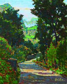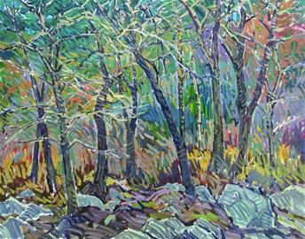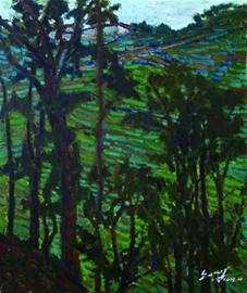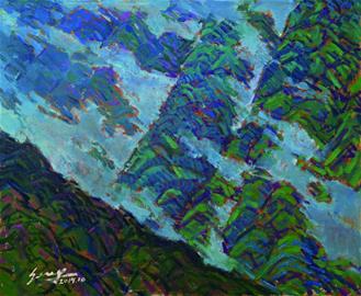 “画面首先必须是写实的、具象的,画得像,才能证明理念的正确性,就像科学实验一样;其次,我采用了点彩的画法,这样便于分解颜色,可以有效地保证色彩在画面中的量级关系。记得第一张作品《太行长夏辰时》完成后,高兴地喊了出来。在山里一周的时间,五幅作品的诞生证明了我的想法,也是初步论证了五行色彩规律在绘画中是可用的。”