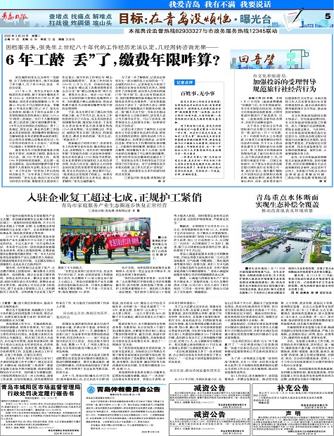 入驻企业复工超过七成,正规护工紧俏协同监督,民有所呼我有所应6年工龄“丢”了,缴费年限咋算?百姓事,无小事加强投诉的受理督导规范旅行社经营行为青岛重点水体断面实现生态补偿全覆盖