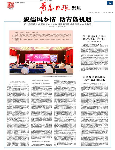 在线上出席青岛分会场会议的王俊霖,是韩国奋斗在山东网站创始人、新华株式会社社长。他原本是在韩国奋斗的华人。“正是基于首届儒商大会,在青岛市招商促进中心指导和帮助下,我们成立了青岛奋韩科技,并上线‘奋斗在山东’韩文门户网站,面向韩国宣传山东和青岛的优越营商环境和便利招商政策,为全省贸易促进、‘双招双引’和对韩交流出一点力。”王俊霖介绍,如今,公司成长为全韩领先的华人互联网服务企业,业务涵盖在韩华人、赴韩留学、赴韩旅游市场等多个领域,还通过整合和优化青岛各分公司优势资源,扩大经营规模,拓宽服务领域,形成中韩进出口+短视频+网红孵化+电商直播新零售生态体系。
