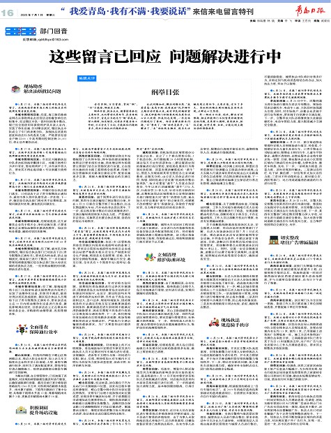 ●6月24日,本报7版刊登市民郑先生留言,反映李沧区漫玉湾农贸市场周边大量摩托车骑手不遵守交通规则问题。