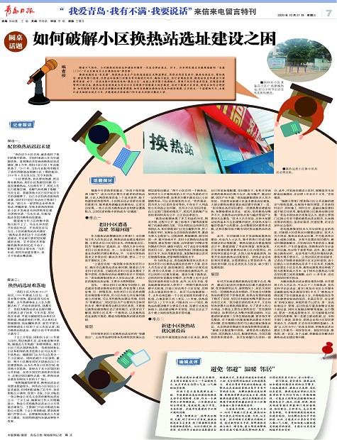 为解决换热站选址建设难的问题,市住建局工作人员认为,可从以下三方面推进。首先是科学论证选址,落实《青岛市市区公共服务设施配套标准及规划导则》中关于“换热站不得设置于住宅建筑垂直下方,不得贴临居住等对安静要求较高的场所,并满足环评、安全要求”的相关规定,审批阶段予以把关。第二是高标准设计、管理,设计阶段尽量选取噪音系数小的设备,同时采取隔音降噪等措施。运行期间,要进一步提高管理水平,尽可能降低对周边居民的影响。第三是建立联动机制,区、市相关部门、街道、居委会、供热企业和小区居民要形成合力,在梳理、汇总存在问题的基础上,本着“以人民为中心”的基本原则,把换热站选址建设工作做为一项攻坚任务,制定时间表、路线图,逐一论证,各个击破,积极稳妥的解决好换热站选址建设难问题。