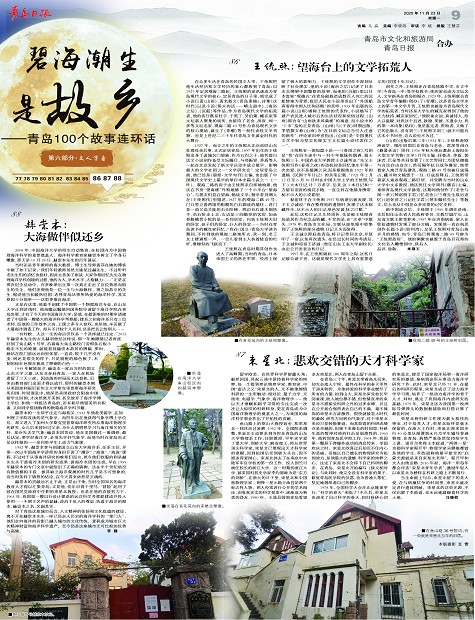 新中国成立后,王统照于1950年调往济南,先后担任山东省人民政府委员、文教厅副厅长、山东省文联主席等职务,1957年在济南病逝。家人在收拾遗物时发现了部分文稿,发现他一直在构思创作长篇小说《胶州湾》,足见王统照对青岛山海岁月的感情。如今,青岛已将观海二路49号辟为“王统照故居”,他的铜像也被置于青岛百花苑的文化名人雕塑园中,供后人品评、致敬。