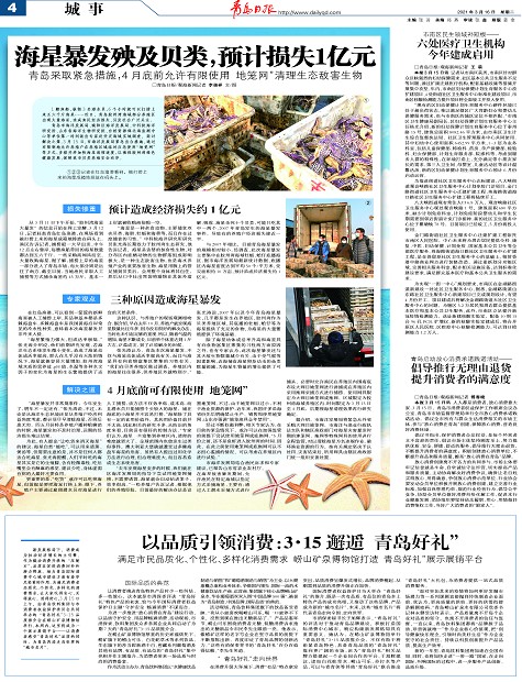 青岛市海洋发展局、城阳区海洋发展局、中科院海洋研究所、山东省海洋生物研究院、自然资源部北海监测中心等单位第一时间派出专家赴受灾海域实地调查,商讨解决之策。3月15日,市海洋发展局紧急出台措施,通过有限制地允许养殖户在养殖区域临时应急使用“地笼网”等方式,多措并举加快海星清理速度,以确保胶州湾绿色健康发展,保障我市贝类养殖安全有序。