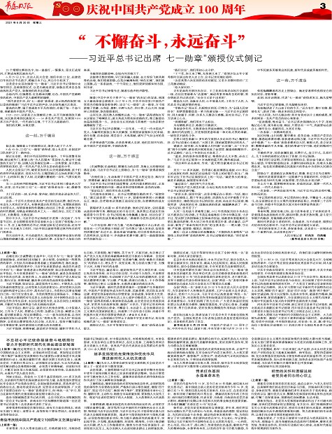 习近平强调,新时代是需要英雄并一定能够产生英雄的时代。中国共产党要始终成为时代先锋、民族脊梁,党员队伍必须过硬。希望受到表彰的同志珍惜荣誉、发扬成绩,争取更大光荣。各级党组织要从工作和生活上关心爱护功勋党员,大力宣传“七一勋章”获得者的感人事迹和崇高品德,在全党全社会形成崇尚先进、见贤思齐的浓厚氛围,激励广大党员、干部牢记党的性质宗旨,牢记党的初心使命,不懈奋斗,永远奋斗,在全面建设社会主义现代化国家新征程上,向着第二个百年奋斗目标、向着中华民族伟大复兴的中国梦奋勇前进。(讲话全文另发)