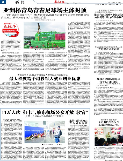 亚洲杯青岛青春足球场主体封顶最大程度给予退役军人就业创业优惠11万人次“打卡”,胶东机场公众开放“收官”东航将持续加大青岛机队规模推进青岛能源产业链建设加快促进“碳达峰碳中和”青岛瑞吉酒店启幕2021青岛国际帆船周将于8月6日启幕光影追忆红色岁月主题影像展开展