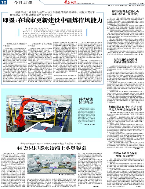 提起冬奥美食,最让人印象深刻的,想必是运动员“吃了200个饺子……”的采访了。水饺不仅深受国际运动员喜爱,还得到国际奥委会主席巴赫的肯定。在即墨区金口镇,就有一家获得冬奥会张家口赛区唯一速冻水饺供应资格的企业——青岛岛尚食品有限公司,它以手工水饺为特色,成功“出圈”冬奥美食,并顺利成为冬残奥会速冻水饺供应商。