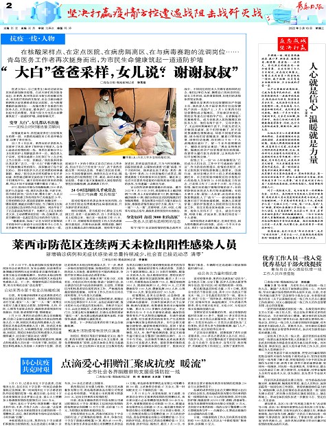 医者父母心,忘己爱苍生!面对这场突如其来的新冠肺炎疫情,白衣天使们再次挺身而出。在莱西、胶州等各区市街头的核酸采样点,在各医疗机构的实验室,在全力救治确诊病例和无症状感染者的定点医院,在与病毒赛跑的流调岗位……岛城无数个负重前行的医务人员,无畏出征,最美逆行,以责任担当扛起市民的期望,用爱与坚守为市民生命健康筑起了一道道防护墙,迎接春暖花开。