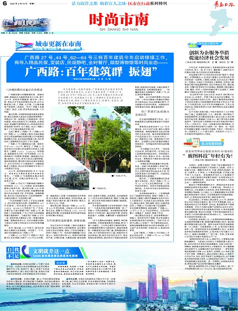 作为青岛第一批城市道路,广西路将在历史城区保护更新的大潮中迎来新变化。记者从市南区获悉,广西路27号、广西路44号和广西路62—64号三栋百年建筑今年将分期启动修缮工作。在修缮施工之前,三栋建筑已完成商业设计,明确运营主体,确定了以精品民宿为主,轻餐饮、变装店、酒吧、咖啡店等时尚业态为辅的发展方向。