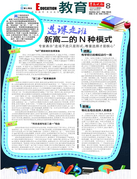 两个周后即将开始的新学期,新高二的学生将迎来全面选课走班。选什么组合直接影响高考院校和专业的录取,学生选得小心,学校排班更谨慎。“完全走班”、“选二定一”、“MT”……全新的高考模式,带来教学和管理模式的全面更新,在对新高考走班模式的摸索中,岛城各高中根据各自的实际情况,采取自己独特的方法,可谓“八仙过海,各显神通”。近日,记者先后走访了青岛一中、二中、九中、实验高中、五十八中及超银高中,深入了解了各校选择的选课走班方式。