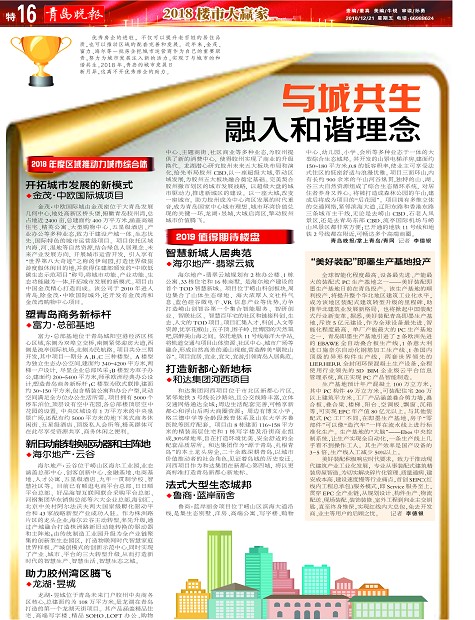 优秀房企的进驻,不仅可以提升老百姓的居住品质,也可以推动区域的配套完善和发展。近年来,金茂、富力、海尔等一批房企把城市运营商作为自己的重要职责,努力为城市发展注入新的活力,实现了与城市的和谐共生。2018年,青岛的城市发展日新月异,这离不开优秀房企的助力。