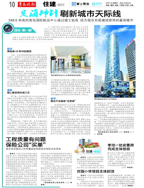 从 “身高”223米的远雄国际广场、237.7米的青岛中心到240米的海航万邦中心、241米的青岛国际金融中心、241.85米的青岛财富中心,一座座摩天大楼拔地而起,并肩耸立,直入云霄,青岛的“第一高”不断被刷新。日前,青岛国际航运中心通过竣工验收,这座高248.5米、海拔总高度295米,形似“定海神针”的建筑后来居上,成为目前我市建成使用的最高楼宇,傲踞中央商务区核心,打造青岛城市新地标。