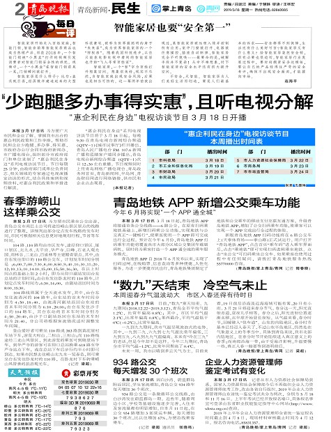 “少跑腿多办事得实惠”,且听电视分解春季游崂山这样乘公交智能家居也要“安全第一”“数九”天结束 冷空气未止青岛地铁APP新增公交乘车功能934路公交每天增发30个班次企业人力资源管理师鉴定考试有变化