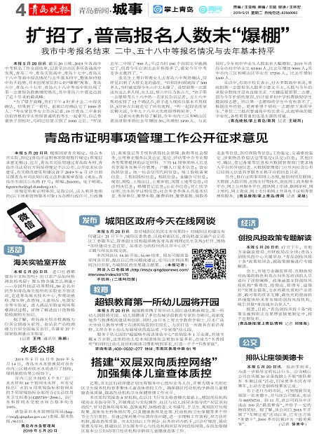 扩招了,普高报名人数未“爆棚”青岛市证明事项管理工作公开征求意见海关实验室开放城阳区政府今天在线网谈搭建“双层双向质控网络”加强集体儿童查体质控超银教育第一所幼儿园将开园创投风投政策专题解读排队让座领美德卡
