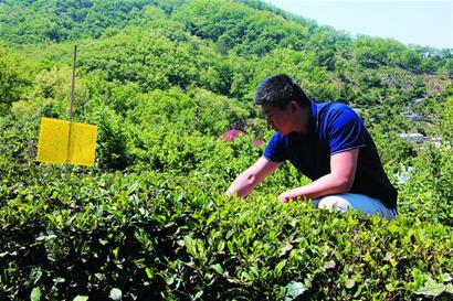 “你看一下,现在开始有虫子了。 ”孟庆彪指着几株茶树让记者看,在茶园管养中坚持不使用农药及除草剂,在茶树间安插生态杀虫板来诱捕和诱杀害虫,减轻茶树病虫害发生,有效保护茶叶环境安全,确保品质无污染。