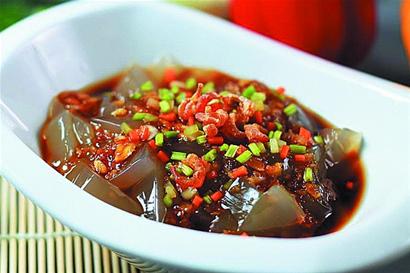石花菜凉粉也是几届的青岛十大特色小吃之一,也是青岛人最爱的下酒菜之一。此小吃的特点是:清爽开胃,渗透着蔬菜的鲜味。