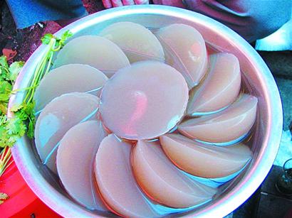 前几天,记者在一家酒店吃饭,端上来的凉粉是整整齐齐的正方体。记者了解到,老青岛人吃凉粉都是把凉粉切成条状,什么时候凉粉变成正方体了?