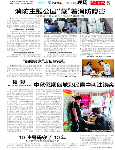 消防主题公园“藏”着消防隐患“蚂蚁搬家”走私耐克鞋中秋假期岛城彩民喜中两注银奖10注号码守了10年