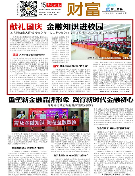 当前,银行产品和服务正呈现出快速化和多元化特征,相比之下,消费者金融基础知识欠缺、风险防范意识不强等问题较为突出。为引导消费者审慎选择金融产品,理性维护自身权益,提升保障自身资金财产安全意识能力,多年来,建行一直注重金融消费者教育,把守护居民“钱袋子“摆到十分重要的位置,持续在岛城开展形式多样的金融知识普及活动,赢得社会的广泛赞誉。组织开展“3·15消费者权益保护”活动、“金融知识万里行”活动、送金融知识进学校、进老年公寓、进社区活动、送金融知识进“财富管理暨金融服务博览会”等系列活动,针对不同类型消费者的宣传需求,通过线上、线下等多种渠道,重点宣传消费者八项权利、产品销售“双录”、保护个人信息等消保知识,提示消费者增强安全意识,守护好个人“钱袋子”,进一步提升消费者金融素养和风险防范技能。建行把金融知识宣传教育活动作为贯穿全年的重点工作,不断延展金融知识普及和银行服务的触角,切实帮助客户做好金融安全服务。