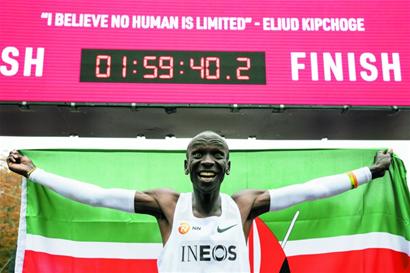 曾有科学家预测,人类想要在2小时以内跑完全程42.195公里的马拉松比赛,大约要等到2075年左右。如今,34岁的肯尼亚人埃鲁德·基普乔格,一位划时代的马拉松跑者,让人类极限被突破的这一天提早56年到来。 2019年10月12日,基普乔格在奥地利首都维也纳举行的“INEOS 1:59”挑战赛中,以1小时59分40秒的时间征服了42.195公里的距离,成为历史上第一位在马拉松比赛中突破“2小时大关”的选手。尽管国际田联因主办者为基普乔格创造了诸多有利条件,而没有将这一成绩认可为新的世界纪录,但它仍然具有不凡的意义。