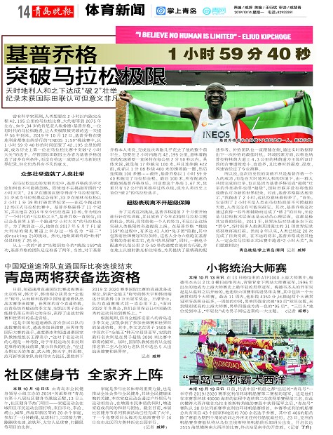 所以说,这次历史性的突破不只是基普乔格一个人的成功,而是在天时地利人和的环境下,由一群人共同完成的壮举。也正是因为基普乔格完成“超级”壮举的外部条件也很“超级”,国际田联并没有将他的成绩认可为新的世界纪录。对此,基普乔格豁达地表示,“我跑进了2小时,这已经意味着很多了。 ”首先,它证明了2小时不是人类在马拉松面前不可跨越的天堑,人类完全有可能突破它。其次,基普乔格这次通过获得一些外部辅助而达成了“破2”的目标,无论是马拉松技术层面还是运动员心理层面,这都是极其宝贵的经验。 2011年,世界泳坛对快速泳衣下达“禁令”,当时很多人推测其因诞生的31项世界纪录将很难再被打破。然而8年以来,人类已经近20次完成了自我突破。在不远的将来,基普乔格或者其他人一定会在马拉松正式比赛中跑进“2小时大关”,我们愿意相信!