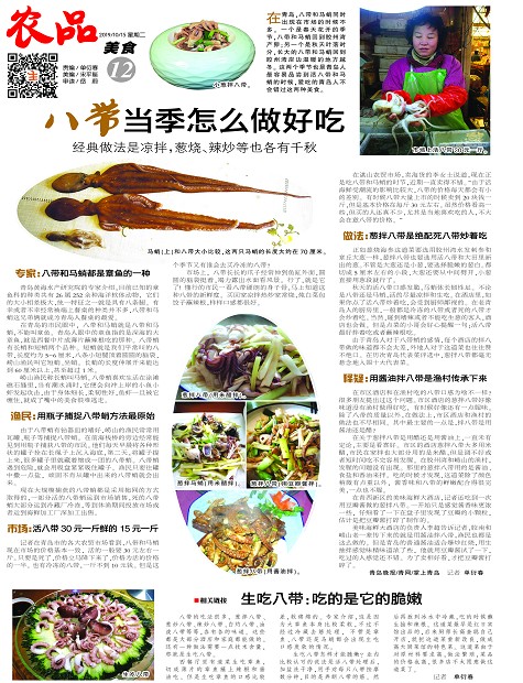 市场上,八带长长的爪子经常伸到鱼缸外面,圆圆的脑袋挺着,竭力露出水面看风景。行了,就是它了!懂行的市民一看八带硬朗的身子骨,马上知道这种八带的新鲜度。买回家凉拌热炒家常烧,炖白菜包饺子蘸辣根,样样口感都很好。