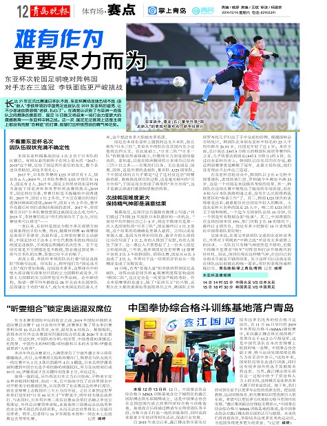 本报12月13日讯 12日,中国拳击协会综合格斗MMA训练基地在位于城阳区的鑫江国际搏击俱乐部揭牌成立,这是中国拳击协会在全国范围内成立的第四家综合格斗训练基地。基地成立后将通过聘请专业师资团队等手段,为格斗选手打造一流的训练条件,同时也将承接青少年培训等相关活动,促进行业发展。