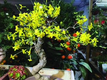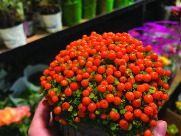除了传统年宵花,一些别出心裁的创意也让顾客眼前一亮,李德金店里主打的贴梗海棠,打造出不同的造型,红彤彤的花瓣贴着枝干成簇展开,很是别致。一盆造型盆景的盛开迎春花更是吸引了不少顾客的眼球,李德金介绍是将迎春花嫁接到造型桩上。牡丹种进盆,开花更显得富贵大气。年轻人喜欢的“精致小玩意”也不少,袖珍玫瑰只有普通玫瑰一半大,珍珠橙只有红豆大小,开满巴掌大的盆,迷你可爱。