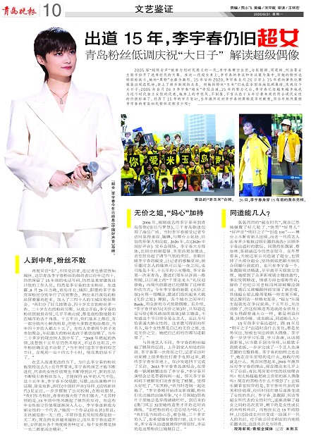 2005届“超级女声”被誉为划时代意义的一代,李宇春横空出世,与张靓颖、周笔畅、何洁等女生联手拉开了选秀时代的大幕。在这一代超女身上,李宇春的争议和非议最为集中,而她的粉丝也特别能战斗,她的“黑粉”也最为激烈。15年后的2020,李宇春8月26日穿上15年前的黄色比赛服装出现在机场,登上了娱乐新闻的头条。而她的粉丝“玉米”们也在全国各地低调集结,庆祝这个大日子:2005年8月26日李宇春“超女”夺冠出道,15年的努力之后,李宇春已经越来越多地成为这个时代独立女性的代表,她身上的中性风、不驯服、不盲从在十五年后看来突然符合现代女性的价值标准了。经历了15年的岁月变幻,当年激烈反对李宇春的黑粉是否有歉意,而当年热烈簇拥李宇春的青岛初代粉丝还剩多少呢?