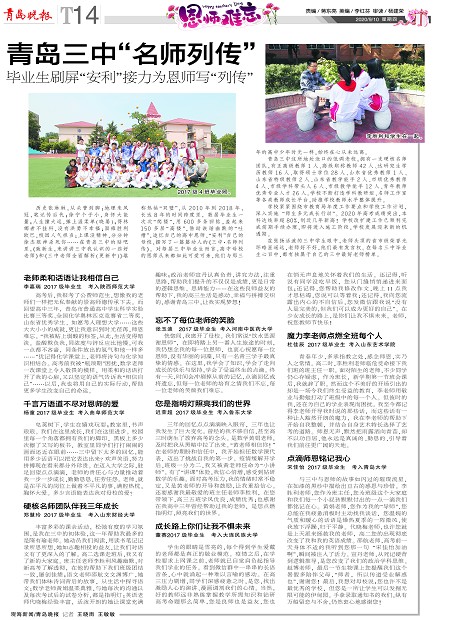 历史张琳琳,从头管到脚;地理朱凤冠,笔记传后代;徐宁个子小,身怀大能量;人生撞大运,摊上温柔单(晓晏);得林娜者不挂科,没有洪勇不幸福;面瘫胜利欧巴,校园人气担当;上课没精神,分分钟徐杰眼神杀死你……在青岛三中的贴吧里,《致新生,来讲讲三中我认识的一些好老师》和《三中老师全面解析(更新中)》堪称热帖“双璧”,从2010年到2018年,长达8年的时间跨度里,数届毕业生一次次“爬楼”,用600多条回帖,盖起来150多层“高楼”,借助诙谐幽默的“吐槽”,追忆自己的高中恩师,“安利”自己的母校,撰写了一篇篇动人的《三中·名师列传》。对每届三中毕业生而言,高中母校的恩师从来都如此可爱可亲,他们与那三年的高中少年时光一样,始终在心从未远离。