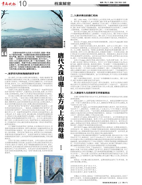 唐代的“新罗坊”和“新罗村”,都是因朝鲜半岛新罗人入唐侨居而形成的居民社区。一般来说,在城镇的多称“新罗坊”,在乡村的多称“新罗村”。当时山东半岛和江苏浙江沿海一带,分布着许多大小不一的新罗坊和新罗村,侨民的主体是新罗商人、海上营运者、水手、造船工匠等。据文献记载,有的新罗坊规模比较大,例如在大珠山港雇用新罗人的海船,一次就可从新罗坊雇八九条船以及熟悉海路的新罗水手数十人。从日本入唐求法僧人圆仁写的 《入唐求法巡礼行记》和新罗著名文人崔致远的诗文中,可知晓当时大珠山港区及青岛周边沿海一带有许多新罗坊、新罗村的事实。