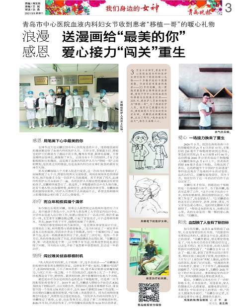 3月8日女神节,青岛市中心医院血液内科的医护女神们收到了特别的暖心礼物——十多幅手绘的卡通漫画像。作者是前来复查的患者——33岁的吴麟,他一度饱受重型再生障碍性贫血折磨,曾创下市中心医院血液内科移植仓住院最长纪录——305天,被医护人员亲切地称为“移植一哥”。为了感谢医护人员,他用自己最擅长的方式,拿起画笔只为记住这些白衣女神。吴麟抗击病魔的故事,正应了那句,“我命由我不由天”,励志又温暖人心。