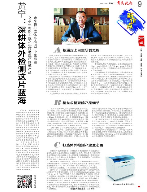 医 疗 行 业 咨 询 公 司IQVIA预测,2023年全球IVD市场将达到804亿美元。一直以来,体外检测器械长期被外资所垄断,位于青岛高新区的山东立菲生物产业有限公司,自主研发检测设备,不但成为体外检测领域的佼佼者,更打造了体外诊断产业发展的生态圈。近日,记者对山东立菲生物产业有限公司总经理黄宁进行了专访,他向记者解答了这家成立不过七年的生物医药企业高速成长的秘密。