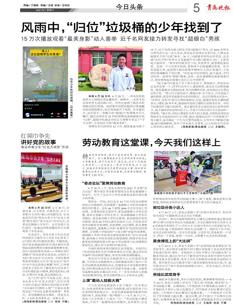 4月30日上午,青岛市教育局2021年首期“奇点论坛”暨市南区劳动教育现场会在青岛基隆路小学举行,拉开了全市中小学劳动教育成果区域化展示的序幕。