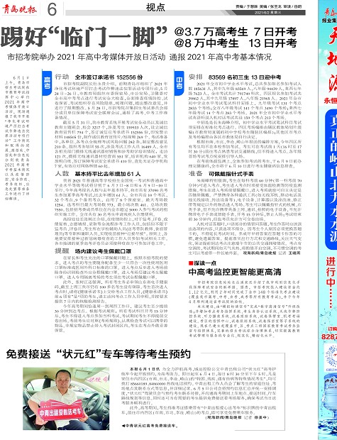 此外,高考期间,考生持准考证搭乘带有“中青出租爱心送考车”标识牌的中青出租车,前往市内四区(市南、市北、李沧、崂山)的考点,即可享受免费乘车服务。