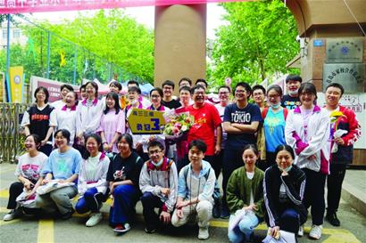 “我们考完啦! ”6月10日中午12时30分,高考生物考试的结束铃声响起,青岛16中考点门口成了集体庆祝高考结束的“天然摄影棚”。以考点大门为背景,到处是考生和家长、考生和老师、考生和考生的合影组合。其中,最庞大的合影阵势,是青岛17中高三三班34名同学和班主任陈光的特殊全家福。 “摄影师”是几十名考生家长,刚刚结束高考的考生们颇有明星在红毯上面对长枪短炮的架势。
