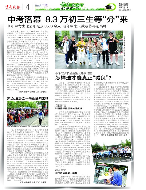 6月15日,九年级中考笔试落下帷幕。青岛83569名考生经历了人生的第一场大考。和高考时家长一片欢腾的送考场面不同,中考考点外,家长大都克制、严肃。 “中考才是第一步,不敢放松。 ”考点外,等候的家长捧着各种暑期辅导班的宣传材料认真比较,俨然一副随时投入新征程的状态。
