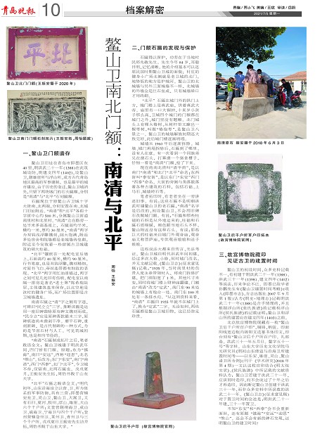 鳌山卫旧址在青岛市即墨区东40里,明洪武二十一年(1388)在此筑城设防,明建文四年(1402),设鳌山卫,辖雄崖所与浮山所,成为古代青岛地区最高的军事建制,也是最早的城市建设。由于历史的变迁,鳌山卫城消失,只留下两块城门的石头匾额,分别是“南清”与“北平”石刻匾额。