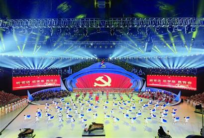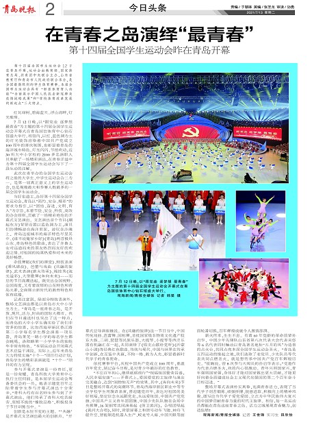 7月12日晚,以“跟党走 逐梦想最青春”为主题的第十四届全国学生运动会开幕式在青岛国信体育中心钻石馆盛大举行。场馆内,以红、蓝色调为主的灯光装饰渲染着中国共产党成立100周年的喜庆氛围,也彰显着青岛的海洋城市特色。灯光闪闪、节拍欢动,近30所大中小学校的2100多名演职人员奉献了一场精彩演出,在青春洋溢中为第十四届全国学生运动会写下了一段生动的注解。
