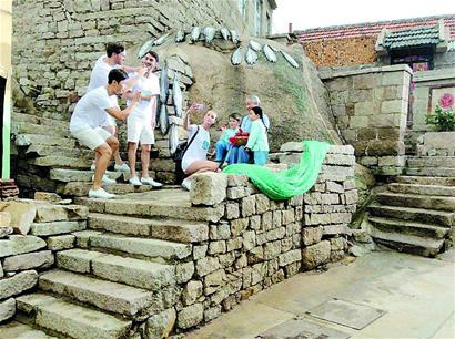 渔村遁隐崂山之上,藏于山海之间,遗世独立,温婉天成。记者探访看到,整个村庄面海依山而建,居民房屋分布高低错落有致,村庄南面,一道道梯田层层延伸到山顶,宛若一条条长龙蜿蜒盘旋在青山之间。沿海岸线一带,景色独特,由于岸边礁石经过海浪多年的拍打,形成五彩斑斓的自然断面,呈现出一层层厚度不一的地质带,被誉为难得一见的“海上地质公园”。红瓦覆顶的二层传统石质建筑小楼,石块砌平的乡间道路,依山就势、运用当地天然石材建造的民居,自前向后,步步登高,院落门窗半掩半现,山墙屋顶高低错落,形成了天然的“青山景观”。青山、梯田、茶园、村落、渔港、海湾、海岛相互映衬,展现出美丽渔村风景,构成一幅壮丽的山、海、天画卷。