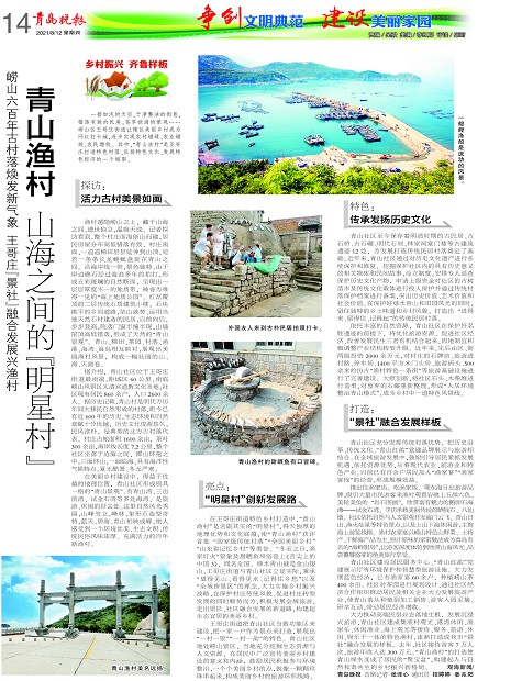 在王哥庄街道特色乡村打造中,“青山渔村”是名副其实的“明星村”,得天独厚的地理优势和文化底蕴,使“青山渔村”获评首批 “国家级传统村落”“全国美丽乡村”“山东省记忆乡村”等美誉。 “冬至之日,渔家灯火”景象及甜晒鱼风俗登上《舌尖上的中国3》,闻名全国。绿水青山就是金山银山,王哥庄街道与青山社区立足实际,秉承“望得见山、看得见水、记得住乡愁”以及“全域皆景区”的理念,大力实施乡村振兴战略,在保护村庄传统风貌、促进村庄转型发展的同时顺势而为,积极发展全域旅游,走出景区、社区融合发展的新道路,构建起生态宜居的美丽乡村。