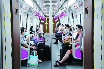 记者注意到,首班车车厢里的乘客不少,有拖着行李赶当日航班的旅客,有前往机场的空姐以及机场服务人员等。