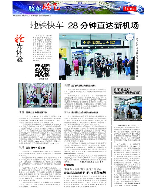 8月12日,青岛胶东国际机场正式投运。为便捷市民出行,连接胶东机场的地铁8号线除延长运营服务时间、压缩行车间隔、提高列车运行速度外,还每日加开4列机场直达快车。 12日早上5时45分,地铁8号线首班直达快车开出,记者从青岛北站乘上这趟列车,到达机场全程用时仅28分钟。