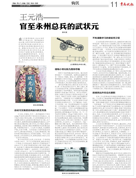 在人文荟萃的胶州,自古以来学文习武者众多。据明清《胶州志》记载,自明万历年间至清同治年间,胶州考中武进士的共有23人,其中最知名的是雍正朝武状元王元浩。清雍正五年(1727年),名列丁未科武进士前20名的王元浩,进京参加了由雍正皇帝主持的殿试。在这次最高等级的考试中,王元浩以高超的武功和卓越的表现,被雍正皇帝的朱笔钦点为丁未科武状元,成为清代山东省屈指可数的武状元之一。