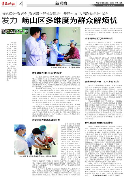 崂山区卫健局在全市率先开展“120-乡医联动急救”试点,创新建立院前急救、乡医及志愿者联合救治工作机制,已有40家社区卫生室、80名乡医志愿者参与服务,实现偏远社区“120-乡医联动急救”全覆盖,有效解决偏远山区居民交通不便、急救接诊时间长的难题。组建基层特色专科联盟,引进群众急需的省市级重点学科专家坐诊,让偏远街道的社区居民在家门口就能看名医,目前已累计服务1.2万余人次,实现名医与乡医教学相长,让更多群众首诊在基层。