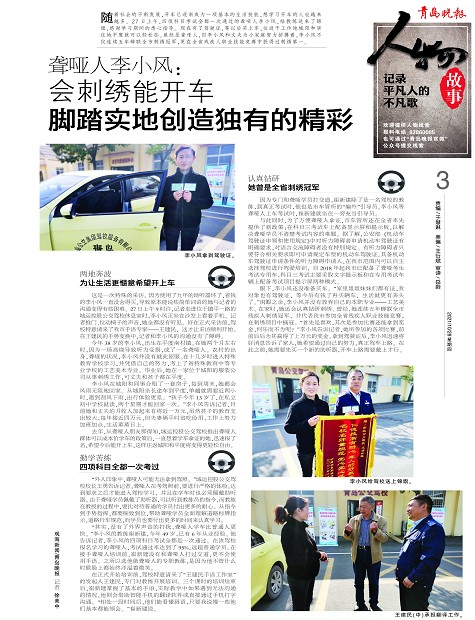 随着社会的不断发展,开车已逐渐成为一项基本的生活技能,想学习开车的人也越来越多。 27日上午,四项科目考试全都一次通过的聋哑人李小风,给教练送来了锦旗,感谢学习期间的悉心指导。现在有了驾驶证,等以后买上车,往返于工作地城阳和居住地平度就可以轻松些。虽然是聋哑人,但李小风和丈夫为小家庭努力拼搏着,李小风不仅连续五年蝉联全市刺绣冠军,更在全省残疾人职业技能竞赛中获得过刺绣第一。
