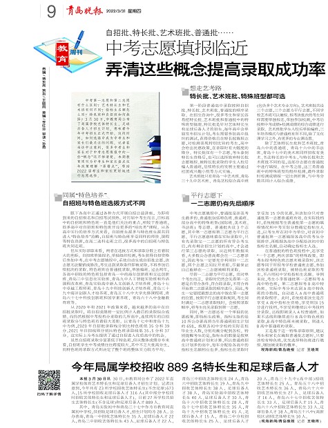 正是基于这一特殊录取原则,建议考生和家长在填报普通批志愿时,只要该校有特色班,优先选择特色班进行填报,增加被录取的概率。观海新闻/青岛晚报 记者 王晓雨