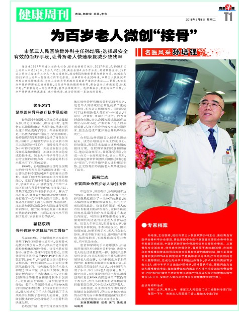 青岛在1987年即进入老龄化社会,据市老龄部门统计,2017年底,我市60岁以上老年人口达176万,占总人口21.9%,高出全国4.6个百分点。统计数据显示,65岁以上的老人每年有三分之一发生过跌倒,超过90%的髋部骨折与跌倒有关。跌倒是我国65岁以上老年人伤害死亡的首位原因。从事骨科专业30年来,市第三人民医院骨外科主任孙培强发现,老年人会因为骨质疏松导致最严重的并发症——骨折,无论是老年性的胸腰椎压缩性骨折,还是老年性的髋部骨折等,都会让老人疼痛难忍,卧床不起,严重影响老人的生活质量,甚至会导致死亡。选择最安全、有效的治疗手段,让老年骨折患者快速康复,减少致残率,成为孙培强一直追求的目标。